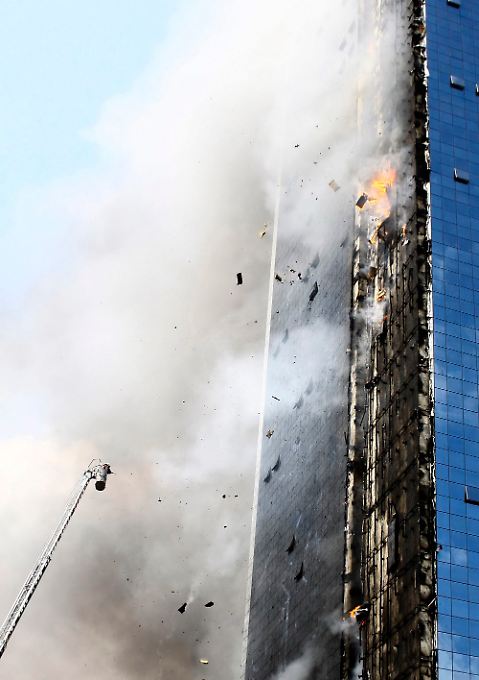 | Sieht auf den ersten Blick ähnlich aus, wie die Feuer der Hochhäuser in den Vereingten Arabischen Emiraten. Mit der scheinbaren Ausnahme, dass hier die Feuer nicht auf die Wohnungen/Büros im Inneren übergegriffen haben. | |||||